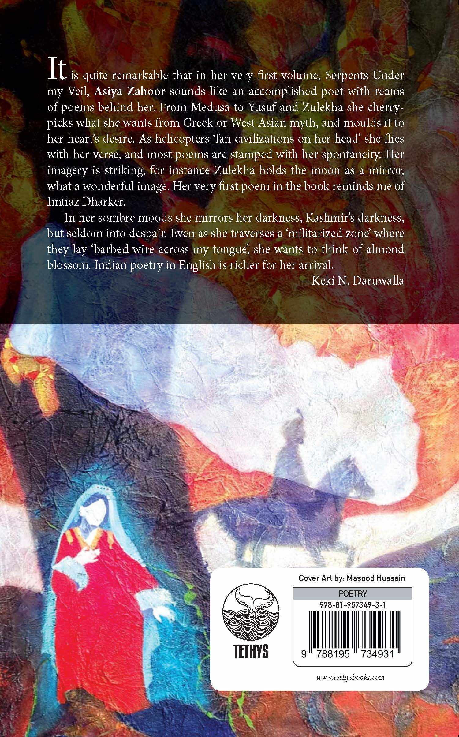 It is quite remarkable that in her very first volume, Serpents Under my Veil, Asiya Zahoor sounds like an accomplished poet with reams of poems behind her. From Medusa to Yusuf and Zulekha, she cherry-picks what she wants from Greek or West Asian myth, and moulds it to her heart's desire. As helicopters fan civilizations on her head she flies with her verse, and most poems are stamped with her spontaneity. Her imagery is striking, for instance, Zulekha holds the moon as a mirror, what a wonderful image. Her very first poem in the book reminds me of Imtiaz Dharker. In her sombre moods, she mirrors her darkness, Kashmir's darkness, but seldom into despair. Even as she traverses a militarized zone where they lay barbed wire across my tongue, she wants to think of almond blossom. Indian poetry in English is richer for her arrival. - Keki N. Daruwalla